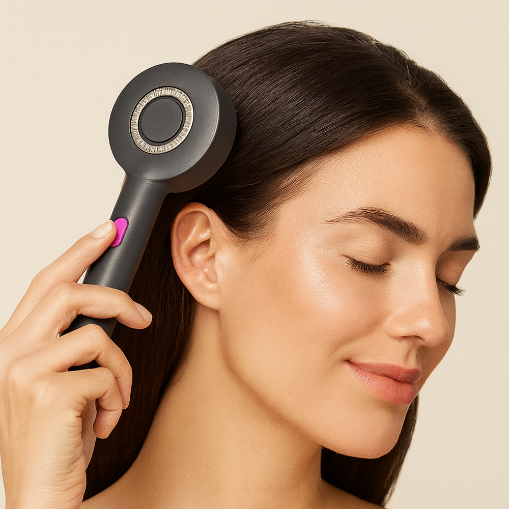 Optimisez vos soins capillaires grâce à notre technologie 2-en-1. Contrairement à l'application manuelle, notre système assure une absorption ciblée sans gaspillage, stimulant la repousse par luminothérapie.